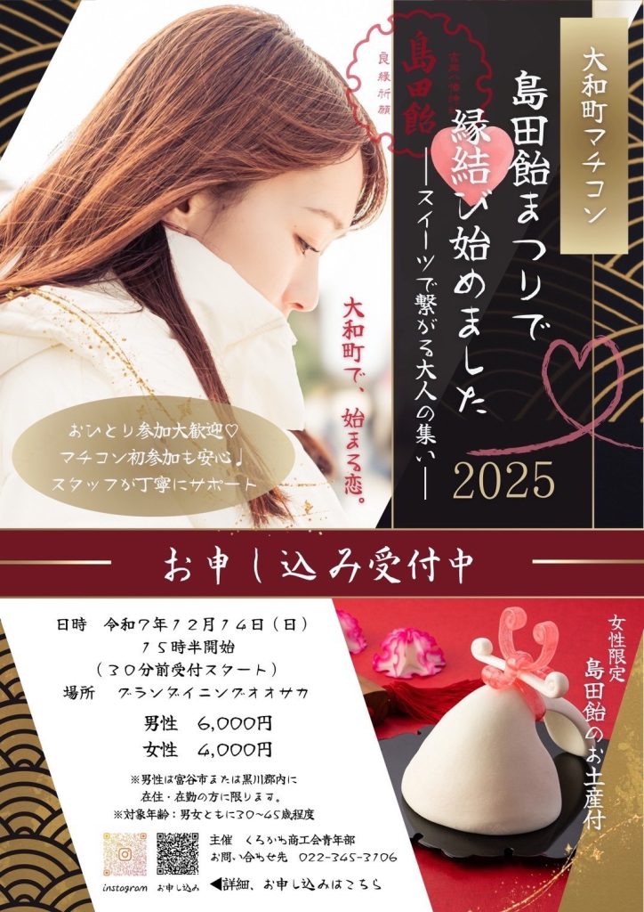 12月14日、島田飴まつりと同じ日に、門前のダイニングで、くろかわ商工会青年部主催の婚活イベントが開催されます。只今、参加者を募集中です。吉岡八幡神社へのお参りとあわせて、楽しいひとときを過ごしてみませんか。きっと良いご縁が訪れることでしょう。